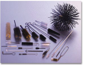 Twisted-In-Wire brushes are known by many names, such as spiral, tube, flue, bottle, pipe, boiler or power brushes. They all represent the same brush construction. In essence, a piece of wire is doubled over and bristle material is inserted between the fold of the wire stem. The wire stem is then twisted into a brush. Ends of the brush can vary, depending on your needs. For example, a brush can have a cut tip, rounded tip or bristled tip. It can have a long end or handle, a short end, one with a ring, loop or cut. Typically the bristle material is located at one end of the brush, and the handle extends from it. However, the bristle can be centered in the wire, with two long ends, one on each side. |